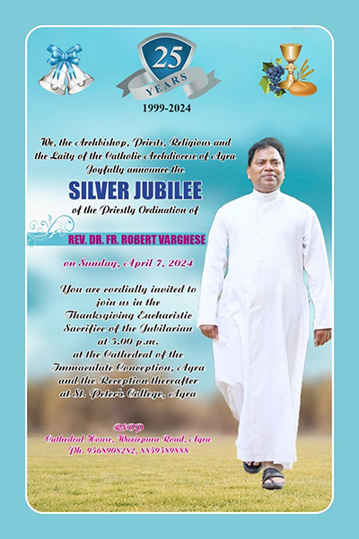 The Archdiocese of Agra celebrates the Sacerdotal Silver Jubilee of Rev. Dr. Robert Varghese (Palatty) on Sunday the 7th April at the Cathedral of the Immaculate Conception, Agra. Fr. Robert was born on 15th March 1973 in Ernakulam district of Kerala. He was ordained a priest for the Archdiocese of Agra on 11th April 1999.